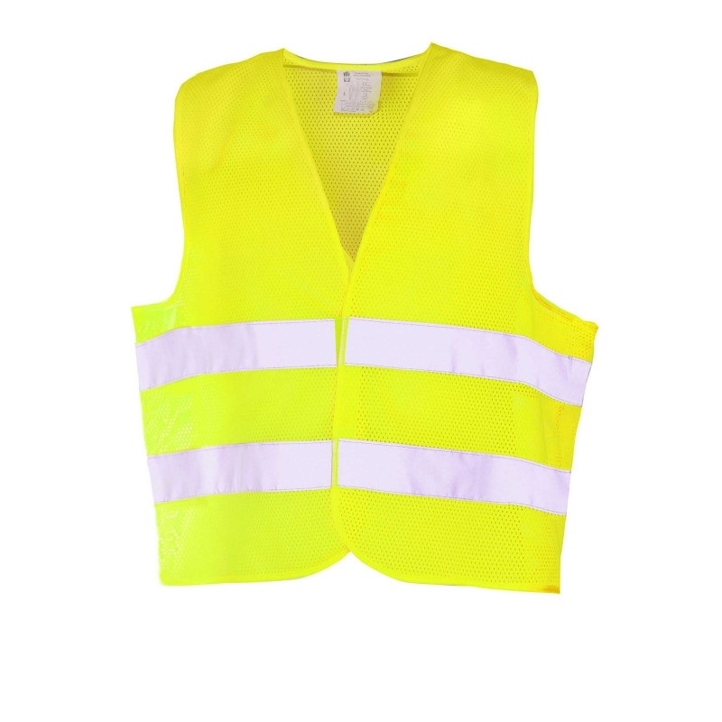 Kamizelka odblaskowa wykonana z wysokiej jakości poliestrowej dzianiny siatkowej – ażurowej w kolorze żółtym fluorescencyjnym z dodatkowymi dwoma pasami odblaskowymi, zapinana z przodu na rzep.