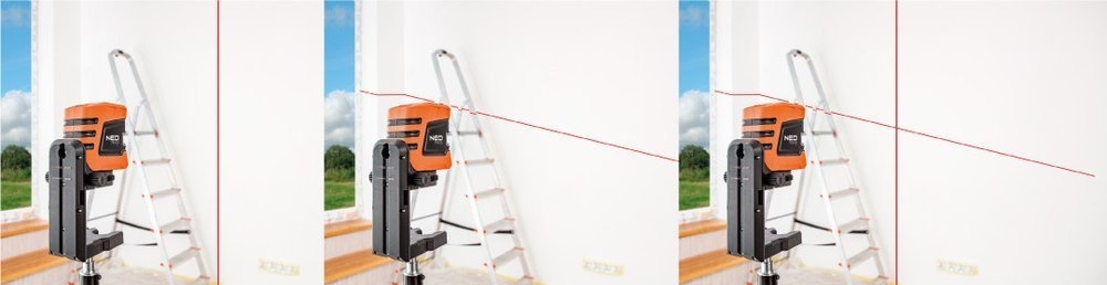 Laser krzyżowy samopoziomujący NEO o długości fali 630- 670 nm znajduje zastosowanie przy pracach budowlanych i wykończeniowych. Produkt służy do wyznaczania linii pionowej, poziomej oraz obu linii równocześnie na dystansie do 15 metrów. Niezaprzeczalną zaletą urządzenia jest skrócenie czasu potrzebnego na prace związane z poziomowaniem. Laser krzyżowy wyposażony jest w mechanizm samopoziomujący w zakresie +/- 4°, co umożliwia dokładną pracę bez konieczności ręcznego wprowadzania ustawień.